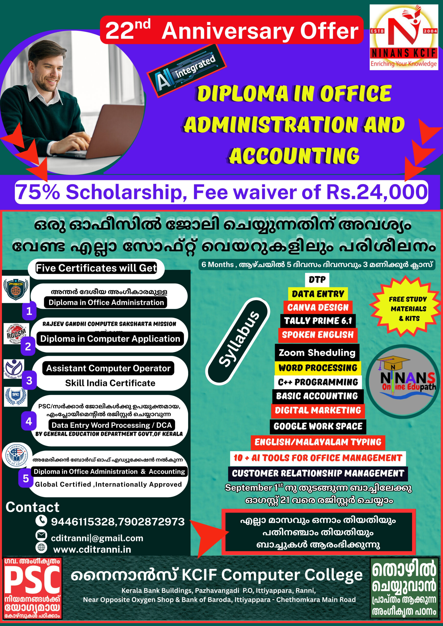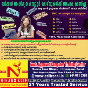 ഇരുപത്തിരണ്ടാം വാർഷികത്തിന്റെ ഭാഗമായി നൈനാൻസ് ഒരുക്കുന്ന Job Assured Computer Course. ഏറ്റവും കുറഞ്ഞ ഫീസിൽ ഇപ്പോൾ രജിസ്റ്റർ ചെയ്യാം.സെപ്റ്റംബർ…